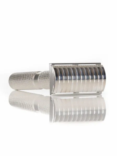 The Weight/Size: The Aluminum razor is lighter, so beginners will have better control as they learn to shave with their double-edge razor. The handle is 14mm x 90mm long, perfect for those with larger or longer hands.