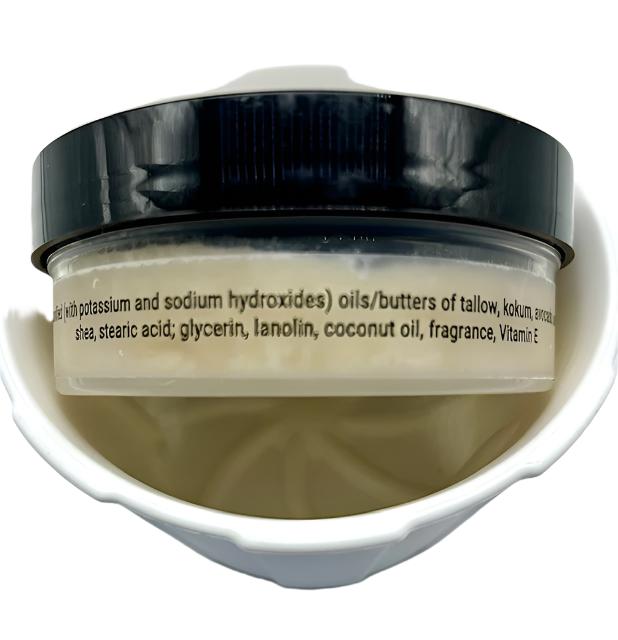 Ingredients: Tallow, kokum butter, avocado oil, cocoa butter, shea butter, stearic acid, glycerin, lanolin, coconut oil, essential oils, potassium hydroxide, sodium hydroxide
